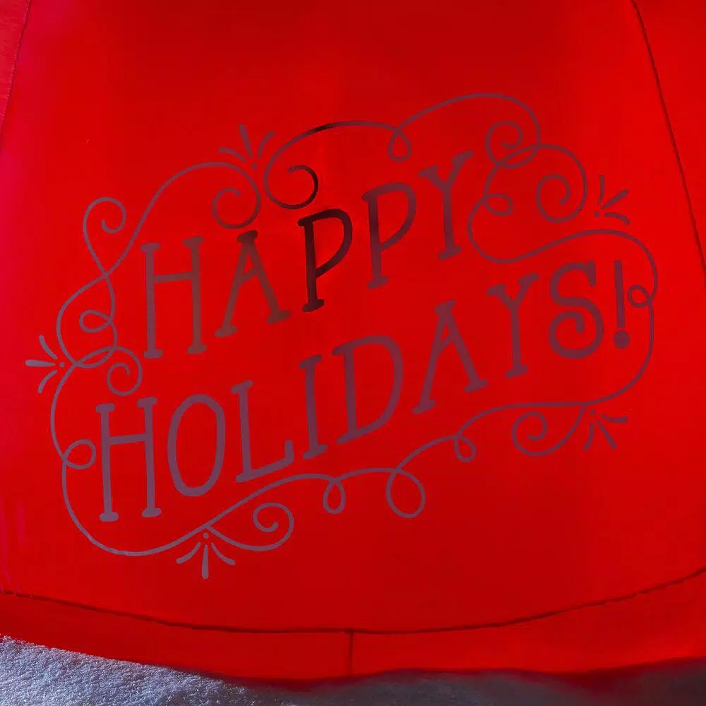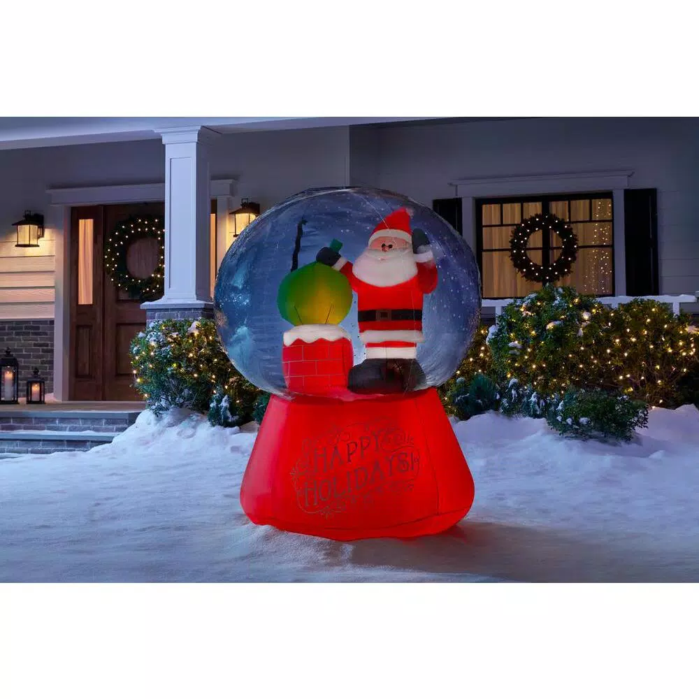 Bring happiness to passersby with this Airblown Inflatable Snow Globe. Santa stands ready on a rooftop as Snow Flurry Projection Lighting swirls all around him. The base reads “Happy Holidays” to bring a smile to everyone’s face. Use it as a standalone piece or group it with other inflatables for a supersized scene. Setup is easy – just plug it in, stake it down and enjoy the fun. Includes everything needed for outdoor setup.