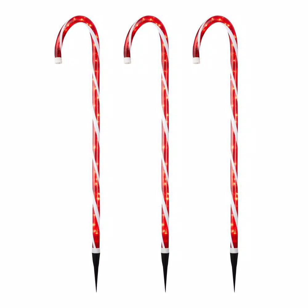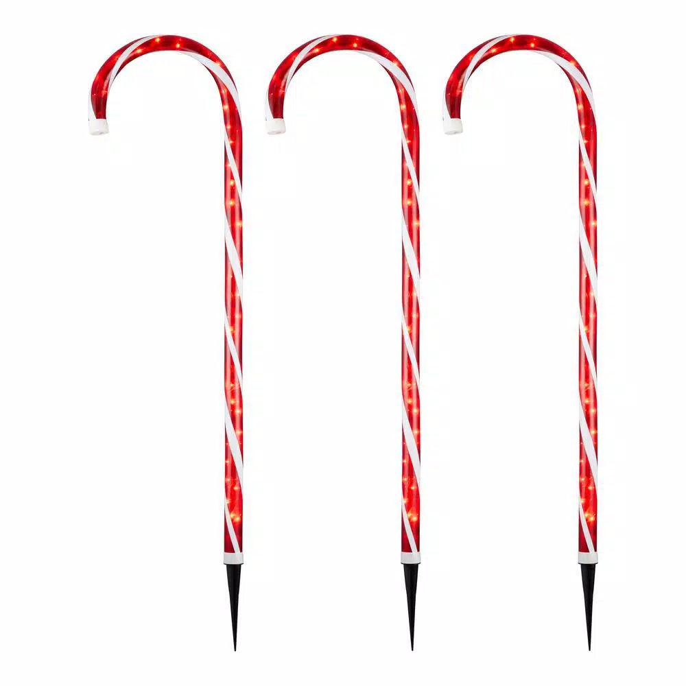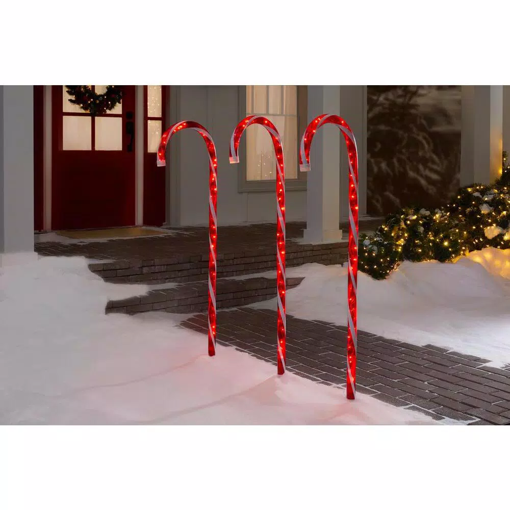 Capture the essence of Christmas when you add this set of 3 pre-lit candy canes pathway stakes. Crafted with 105 clear, incandescent lights, these decorations are perfect for walkways, driveways and other outdoor landscaping. You can use them indoors or outdoors. For a dazzling display, attach multiple sets with the included end-to-end connectors. The candy canes come with attachable stakes for easy, secure placement.