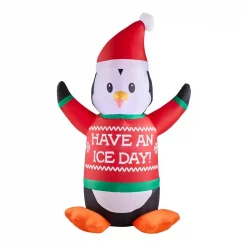Bring holiday happiness to passersby with this Airblown Inflatable Penguin. Decked out in a Santa hat and red sweater that says “Have An Ice Day,” this adorable animated inflatable shivers and shakes. Use it as a standalone piece or group it with other inflatables for a supersized scene. Setup is easy – just plug it in, stake it down and enjoy the fun. Includes everything needed for outdoor setup.