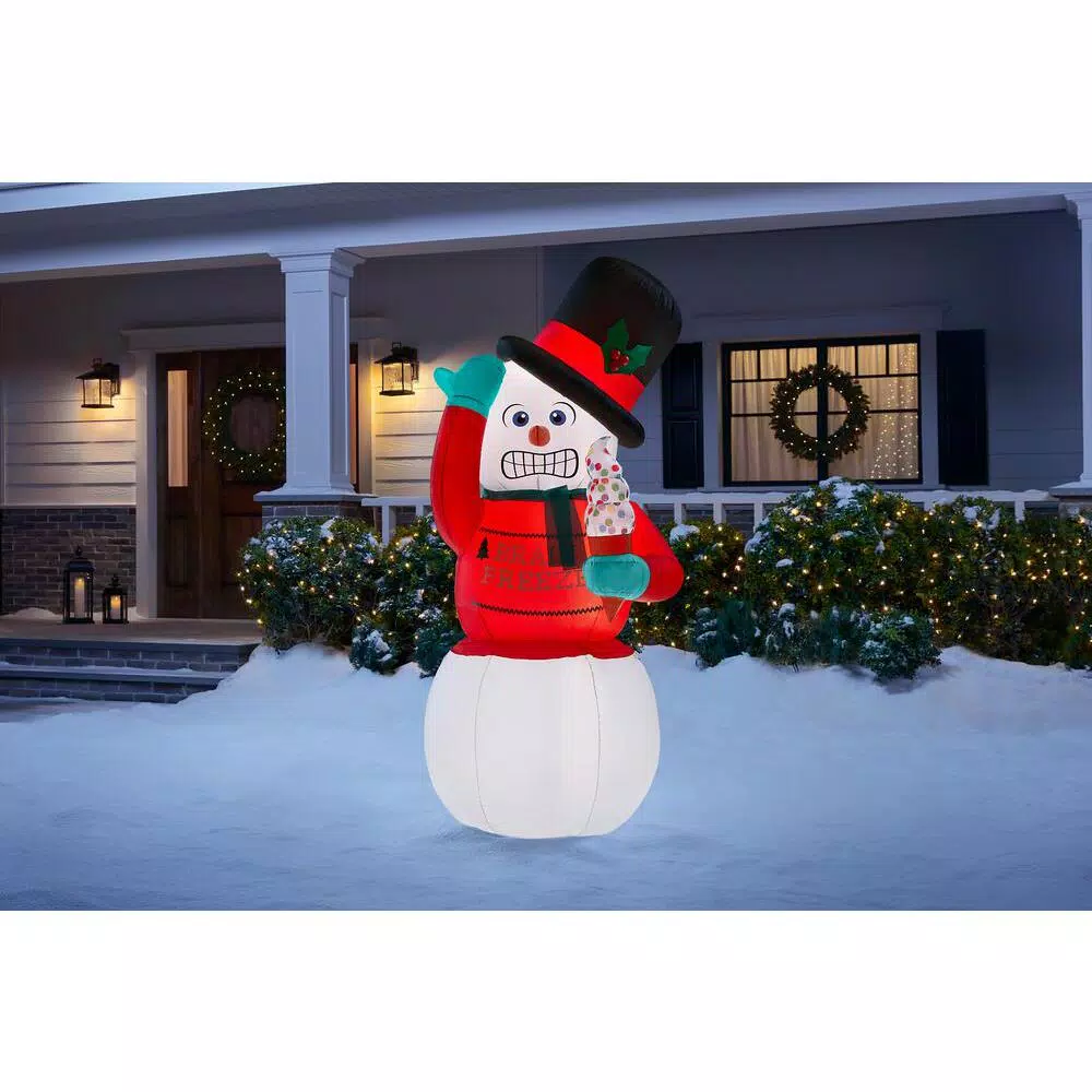 Bring holiday happiness to passersby with this Airblown Inflatable Snowman. Decked out in a top hat and ugly red sweater and holding an ice cream, this adorable animated inflatable shivers and shakes. Use it as a standalone piece or group it with other inflatables for a supersized scene. Setup is easy – just plug it in, stake it down and enjoy the fun. Includes everything needed for outdoor setup.