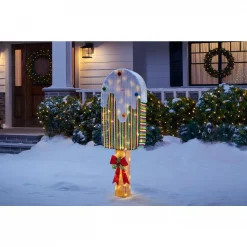 This head-turning yard sculpture will be the star of your holiday display. Featuring 120 stunning LED lights, this 70-in. peacock decoration is made with a durable metal frame and weather-resistant fabric. Use this charming bird in either indoor or outdoor spaces. The long-lasting bulbs remain cool to the touch and will shine through the season. The sculpture is easy to set up, and it includes ground stakes.
