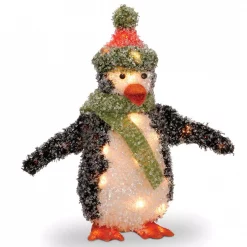 This handcrafted decoration creates a holiday scene featuring Santa, his reindeer, and holiday gifts in front of a glowing tree. This sculpted piece is constructed of metal and wire components painted in a distressed finish. The tree is lit from behind with battery operated warm white long lasting LED lights.