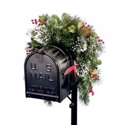 The mailman and your neighbors will be impressed with your 36 in. Wintry Pine Collection Mailbox Cover. Trimmed with faux pinecones, red berries, snowflakes and featuring 72 tips for added fullness, this attractive mailbox swag is easy to attach and spreads holiday cheer for all to see. Flame resistant, tie wraps are included for secure and easy placement.